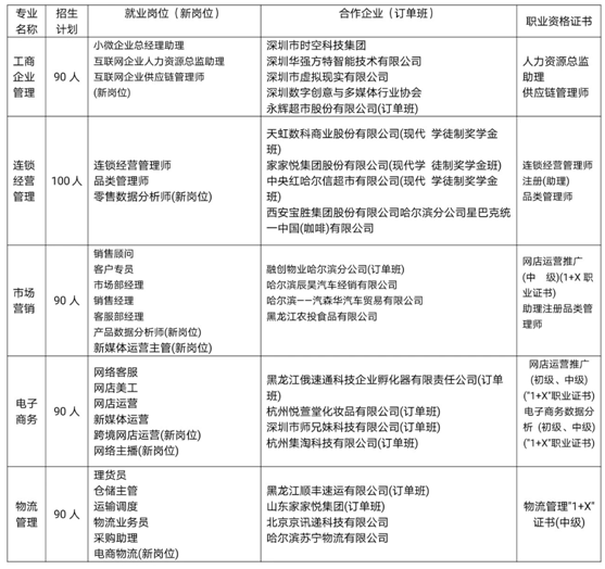 BB贝博艾弗森官方网站工管学院被誉为“龙江商贸经济的摇篮”。各专业均是“龙职”和“龙江”的品牌专业,是黑龙江省同类专业招生报考人气最旺的专业。工商管理学院引真实企业项目进校园,与黑龙江省电视台联合,与世界五百强零售企业、国内知名企业进行现代学徒制人才培养,为企业提供拥有商业大数据分析能力、项目运营管理能力、全渠道集客销售能力、数字化营销能力、新媒体技术应用能力、客户关系管理与运维能力、物流规划管理能力的复合型技术技能商业领域杰出人才!学生入学后经双向选择即可进入相应的现代学徒制班,实现入学即入职,毕业即就业。学院近3年初次就业率平均达90.16%,用人单位对毕业生满意率平均达95.06%,毕业生就业对口率平均达94.98%。毕业生分布北京、上海、深圳、杭州、昆山、黑龙江等地区,毕业三年后精英校友工作年薪达20万以上。