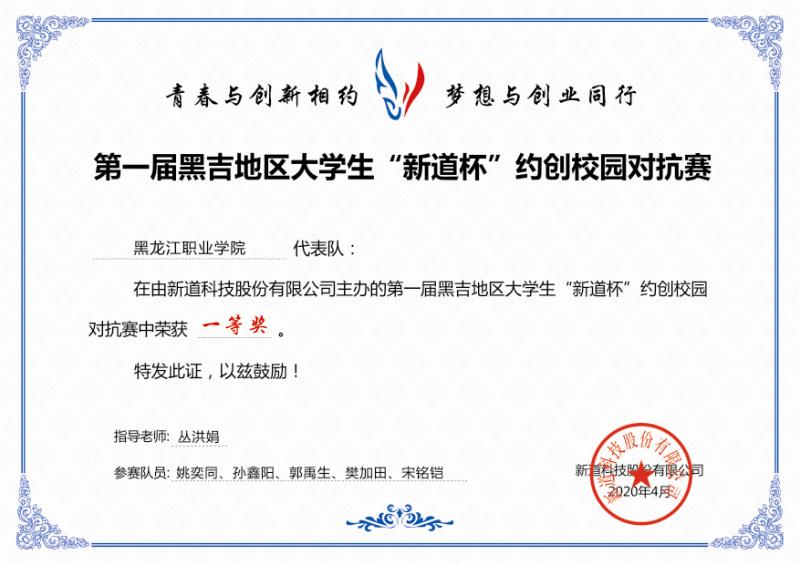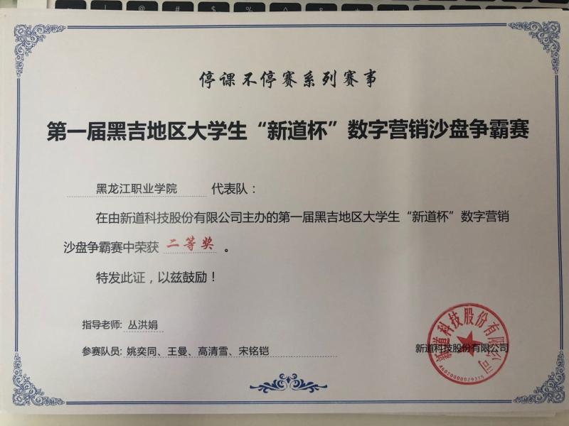 疫情期间,在丛洪娟、初蕾两位教师的指导下,工商企业管理专业学生参加了新道科技股份有限公司主办的黑吉地区大学生“新道杯”约创校园对抗赛,龙职一队获得一等奖,龙职二队获得二等奖;在黑吉地区大学生数字营销对抗赛中获得二等奖。