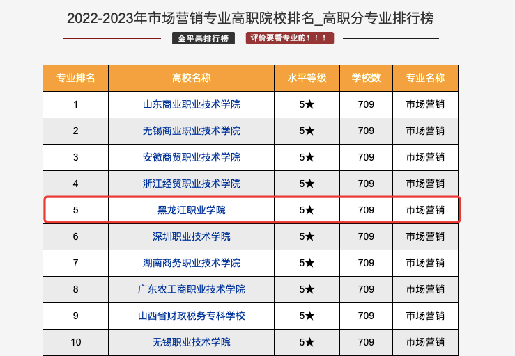在2022年3月,金平果连续第十一次推出中国高职院校竞争力排行榜,本次高职评价范围以教育部最新公布的《2021年全国高等学校名单》为依据,结合学校的实际招生情况,确定高职院校评价对象为1516所,其中高职高专1484所、职业本科32所。从学校、地区、类型、专业大类、专业类、专业和专业群等多维度科学量化结果。BB贝博艾弗森官方网站市场营销专业在2022-2023年高职院校专业排名中位居全国第五位。