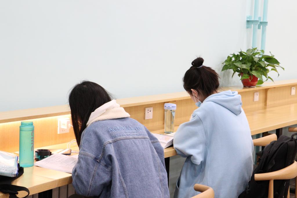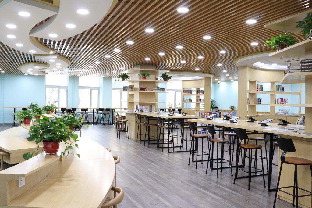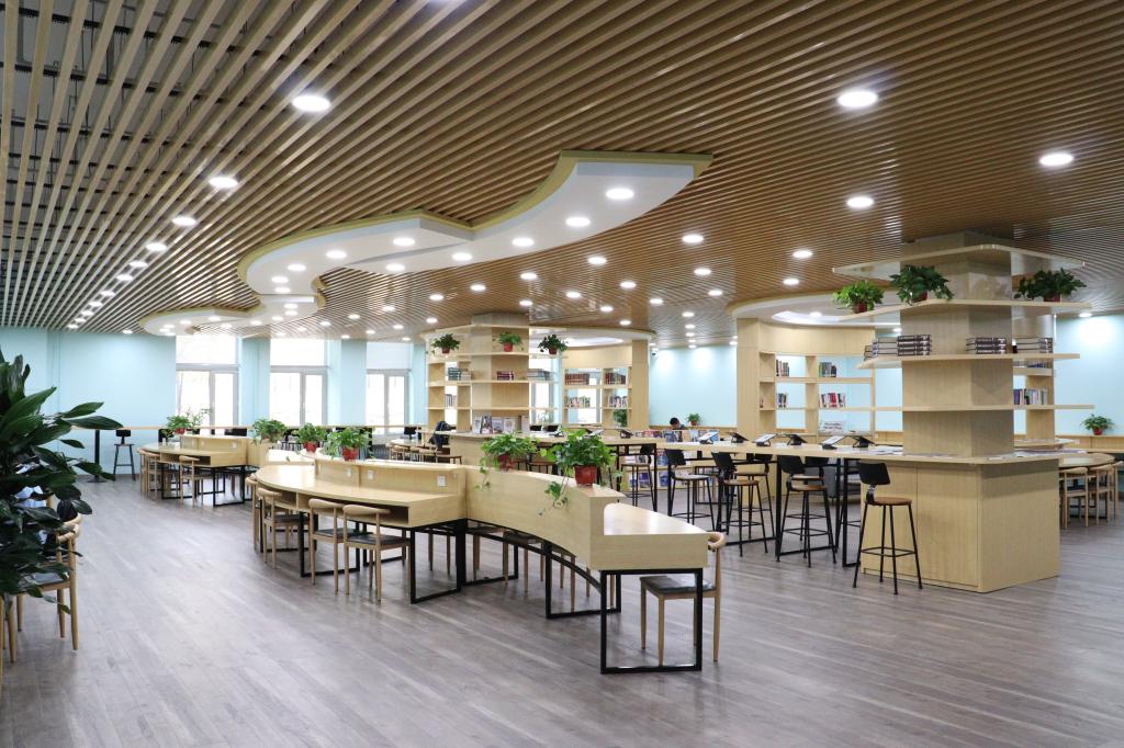 工匠楼多功能阅览厅,棚顶灯光采用5700K接近自然光护眼色温,桌面配备智能人体感应阅读照明灯,书桌搭配五孔和USB插座满足各种设备需求,为读者营造温馨、舒适、整洁的阅读环境。