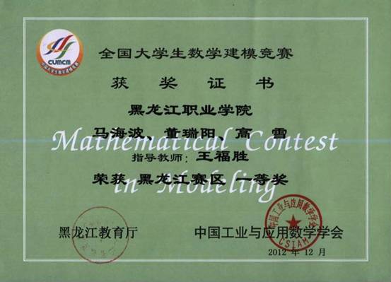 2012年全国数学建模大赛获奖情况公布,BB贝博艾弗森官方网站三支代表队分别获得黑龙江赛区一、二、三等奖。