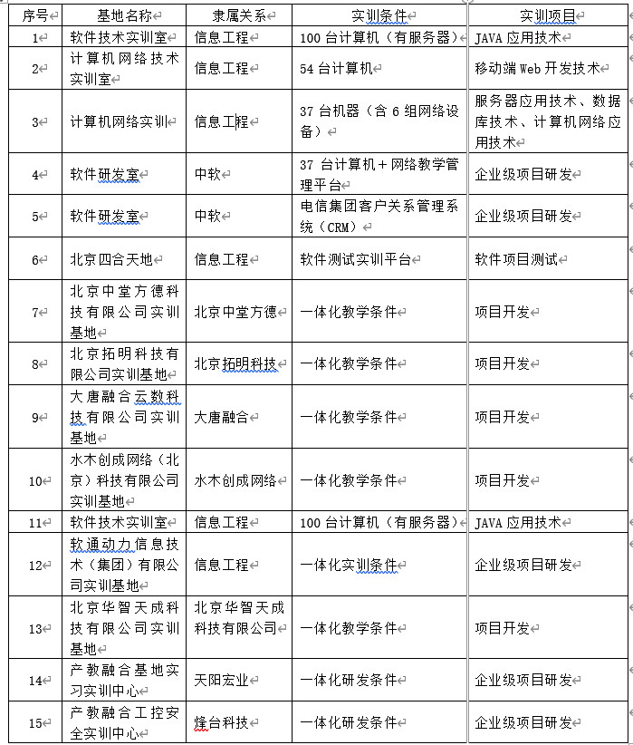 软件技术专业校内外实训基地一览表