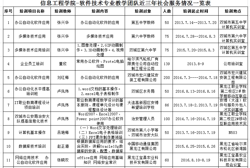 以软件技术专业带动专业群其它专业社会服务,对外开展计算机及信息技术类职工培训、联合企业开展技术应用研究、承接生产任务等社会服务活动,每年为社会培训约500人。