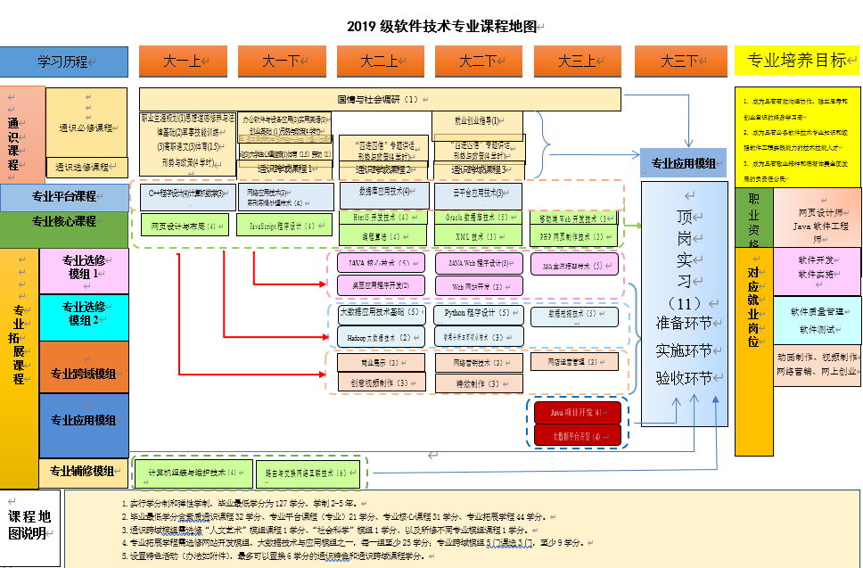 核心课程: 网页设计与布局、数据库技术、编程算法、XML技术、云平台应用技术、C++程序设计、JavaScript程序设计、Html5开发技术、PHP网页制作技术、移动端Web开发技术、JAVA核心技术、桌面应用程序开发、JAVA Web程序设计、Web网站开发、JAVA主流框架技术、大数据应用技术基础、Hadoop大数据技术、Python程序设计、数据分析与可视化技术等