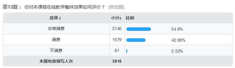 本次在线座谈,为期1周时间,共收集调查问卷3743份,学生参与率99.82%,课程教学满意率达97.68%。通过本次座谈,以及不记名网上填写“在线教学问卷”,使得每位教师倾听到了学生在线学习的心声,了解到学生对每名教师每门课程在线教学的评价、意见和建议,以针对性的解决在线教学存在的问题,为每名教师今后在线教学明确改进和完善的方向,持续提高在线教学质量。