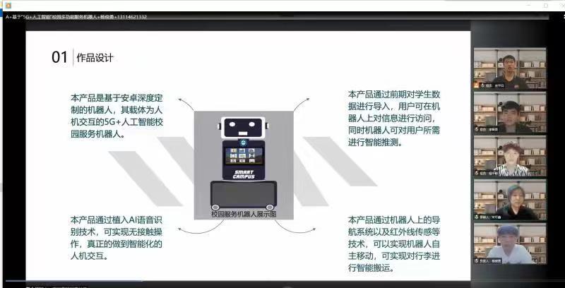 据杨同学介绍,该项目是基于安卓深度定制的机器人,其载体为人机交互的5G+人工智能校园服务机器人, A I语音识别技术,可实现无接触操作,真正的做到智能化的人机交互。在机器人系统中植入A I语音识别技术,可实现人与设备间无接触的操作。