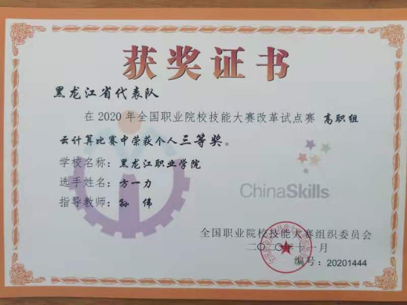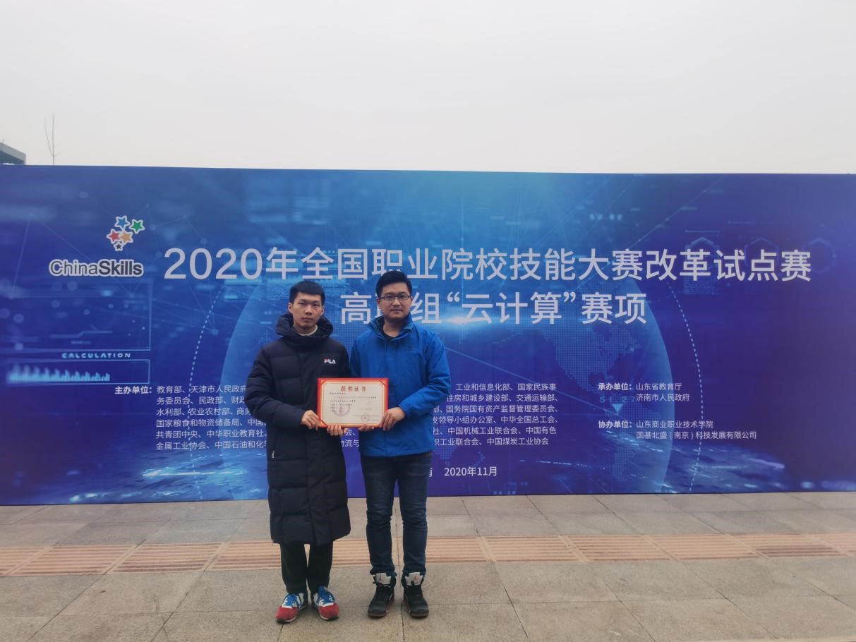 2020年11月28日-30日,由教育部、工业和信息化部、国家发展和改革委员会、山东省人民政府等主办的2020年全国职业院校技能大赛改革试点赛高职组“云计算”赛项在山东商业职业技术学院举行,来自全国31个省份31个选手参加了比赛。经过角逐,由信息工程学院孙伟老师带领的软件技术专业19级学生方一力取得了改革试点赛国赛三等奖的好成绩。