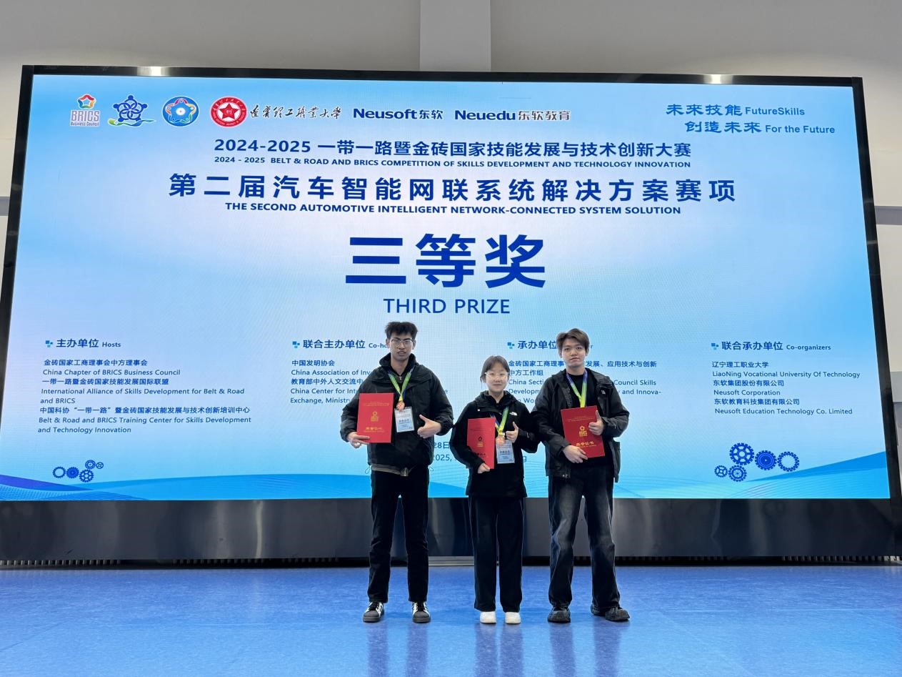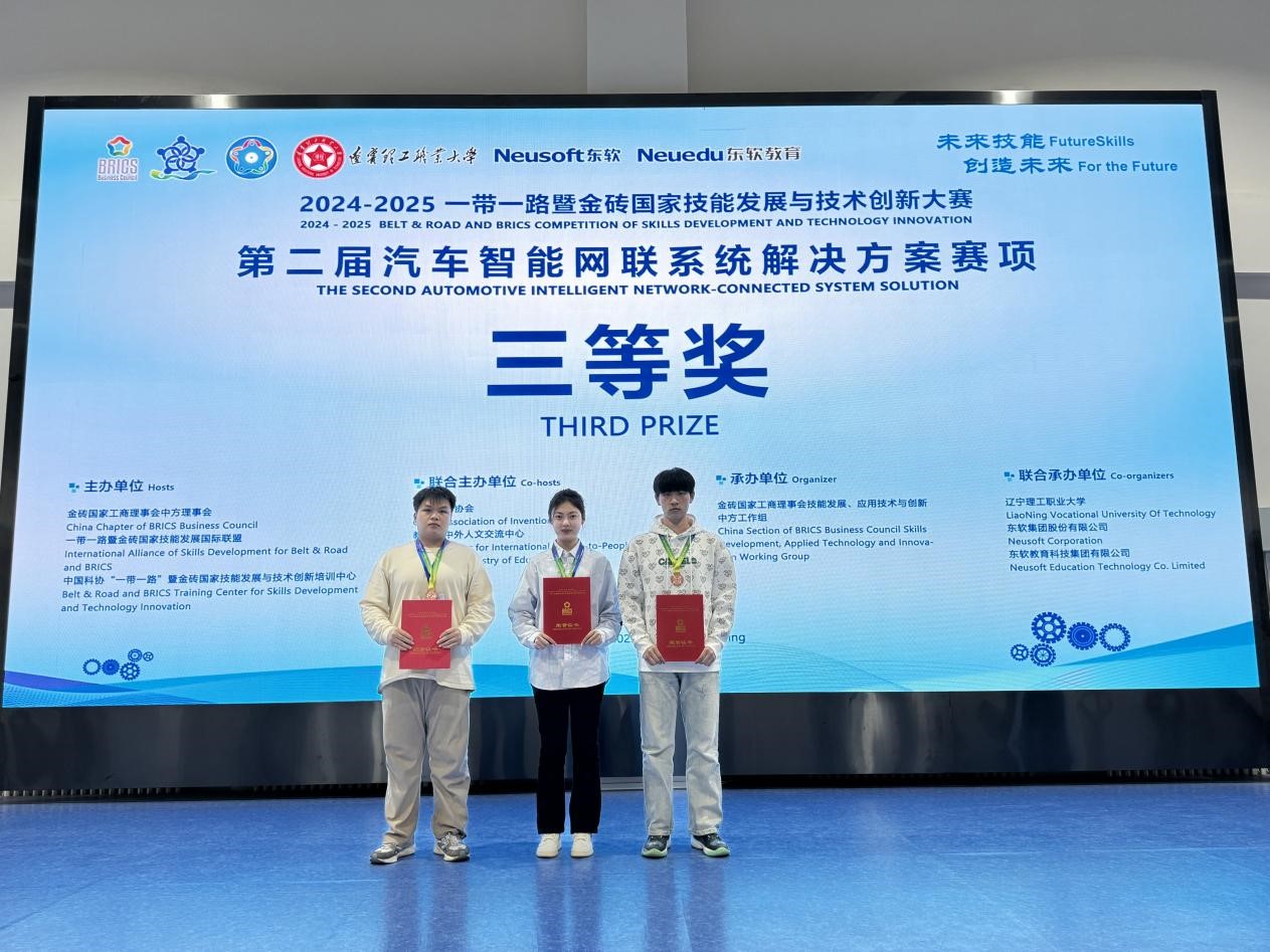 2025年3月28日-29日,2024一带一路暨金砖国家技能发展与技术创新大赛之汽车智能网联系统解决方案赛项国内赛决赛在辽宁理工职业大学隆重举行,来自全国的55支参赛队伍同台竞技,贝博官网信息工程学院邱志旺、宋志鹏、杨雪以及陈明泽、曹耘赫、丁莹六名学生组成的两个团队,凭借着娴熟的专业技能、良好的心理素质,分别获得三等奖,为学校争得了荣誉。
