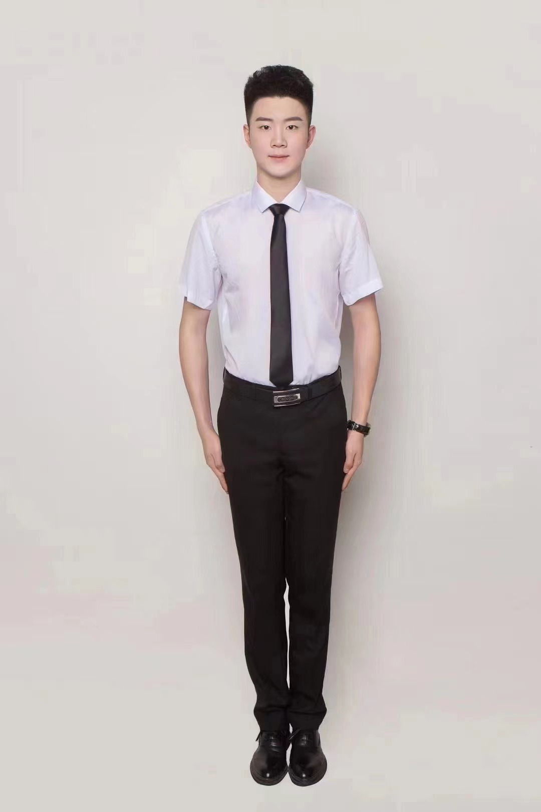 2、着短袖上衣,女生须着裙装(裙子在膝盖上下3CM),需着深色皮鞋。